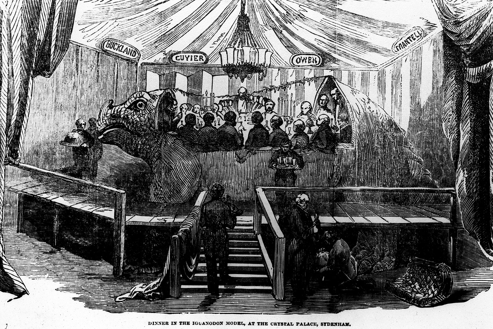 Cette vision des dinosaures, Owen la mettra en oeuvre en 1854 avec le sculpteur Waterhouse Hawkins qui sous sa direction réalise plusieurs reconstitution grandeur nature des dinosaures pour les jardins de Crystal Palace. Ils organisèrent même un banquet de vingt personne à l'intérieur d'un Iguanodon. Ces reconstitutions , bien que non conformes à la réalité, sont toujours visibles par le public.